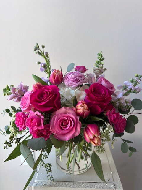A lush, romantic floral arrangement designed to make a statement. Handcrafted flowers feature premium roses in vibrant pink, accented with delicate ranunculus, tulips and soft white blooms for contrast. This piece is perfect for a new romance.